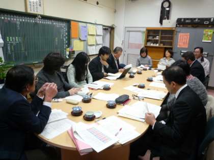 午後7時から、校長室で本年度の学校関係者評価委員会から、学校から出された自己評価報告書に基づいた評価委員会からのコメントを、学校運営委員の方々に報告していただきました。本年度初めて試みた取り組みでしたが、評価委員会から出されたコメントについて、また、学校から出された自己評価報告書について、真剣に玉川小をよくしていこうという意気込みの感じられる中で、1時間30分の時間を要して質疑応答が行われました。これらの話し合いを、来年度の学校経営に生かしていこうと思っております。なお、3月になりましたら、学校からの自己評価報告書、並びに、評価委員会からの報告書をホームページに掲載する予定でおります。しばらくお待ちください。