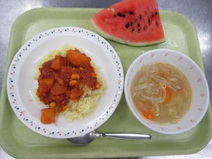 チリビーンズライス 牛乳 ベーコンと野菜のスープ くだもの(すいか)