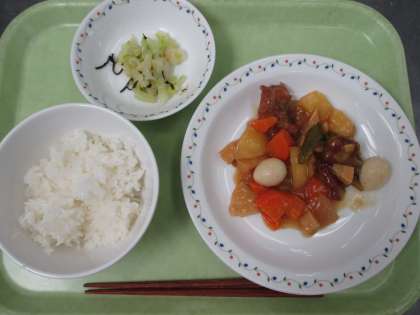 ごはん 牛乳 酢豚 きゃべつの塩昆布かけ