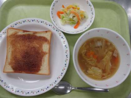 シナモントースト 牛乳 白いんげんの田舎スープ コーンサラダ