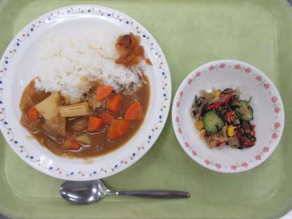 カレーライス 牛乳 福神漬 大根とひじきのサラダ