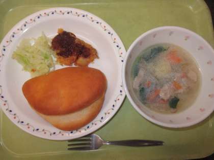 ミルクパン 牛乳 魚のフライ ゆできゃべつ ベーコンと野菜のスープ