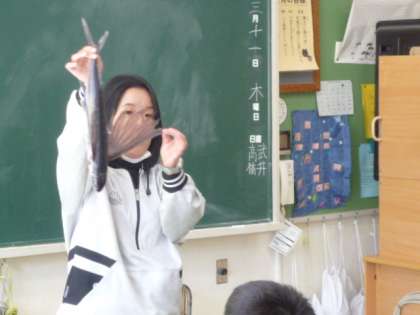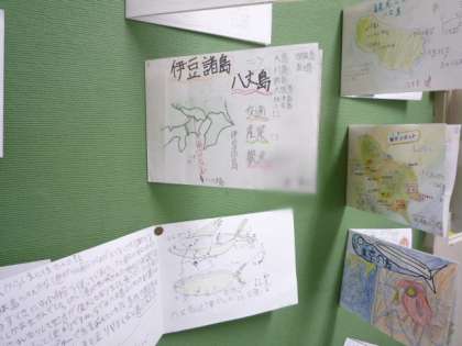 4年生は今、八丈島など島で暮らす人たちの学習をしています。そんな中、教室に写真のような魚が紹介されました。トビウオです。わざわざ八丈島から直送されたものです。八丈島の名物のトビウオって、どんな魚かな?実物を直接目にして、「子どもたちはどのくらい飛ぶの?」「どうして、ひれがおおきいの?」「思ったよりスマート」いろいろな気付きや疑問や感想を持てました。4年2組の廊下には、八丈島について調べた立派な作品(しおり)が掲示されていました。おまけに、今日の給食はトビウオのコロッケということでした。