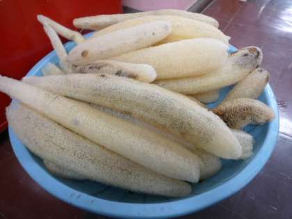 大根でしょうか?レンコンでしょうか?いえいえ、これは、4年生が丹精込めて育てて収穫した、へちまです。すっかり実の部分が取れて、繊維部分だけが残っているへちまたわしの完成です。全部で30本くらいできました。後日お分けするそうです。