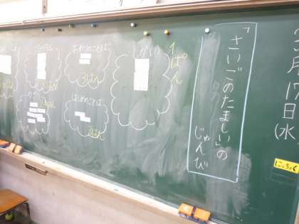 1年3組では、1年生最後のお楽しみ会を計画・準備を学級活動の中で行っていました。お楽しみ会の名前が「さいごのたましい」!?というそうです。1年間の最後なので、気持ちを込めてという意味があるそうです(子どもたちからのアイデアと言っています)。司会班、準備班、はじめの言葉の班、おわりの言葉の班、飾り班、・・といくつかのグループに分かれて熱心に準備をしていました。それぞれの班が、写真のように話し合いを行い、準備をしっかりしていました。司会班では、プログラムに合わせてだれがどこを司会するのか、ジャンケンで決め、不都合なところは相談しあいながらしっかりと決めていました。1年生の潜在能力の高さにびっくりさせられました。23日(火)に「さいごのたましい」をやるそうです。楽しみにしています。