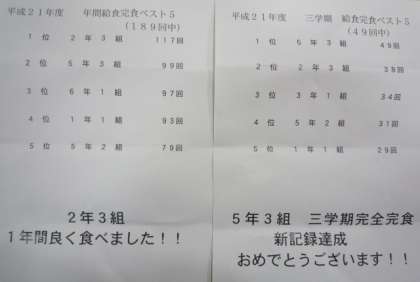 修了式の後、今年1年間の給食の完食回数ベスト3の表彰式を行いました。年間189回の給食回数の中で、1位は、2年3組の117回、2位が5年3組の99回、3位が6年1組の97回でした。また、三学期49回の給食の中で、5年3組は49回と、完全完食を記録したので、完全完食大賞として表彰されました。どの学級もかたずをのんで聞いていました。2年3組と5年3組はどちらもすばらしい成績でした。来年度もこの表彰を行いますので、学級で頑張って給食の完食めざしましょう。