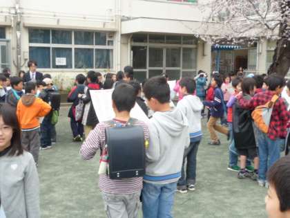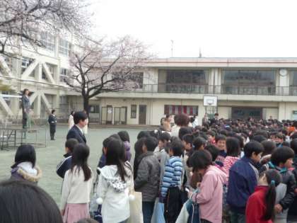 昨日の雨も上がり、今日は朝早くから子どもたちが学校に登校してきて、校庭で、友達との再会を喜び合う間もなく、新しい学級編成のプリントに食い入るように目を落としている様子が印象的でした。始業式の最中も興奮して静かに聞くように何回か注意されたりしていました。学級担任の発表の時は、子どもたちの歓声が校庭に響きました。「よろしくお願いします。」と担任の先生と一斉にご挨拶をして始業式が終わりました。そのあと、わずかな時間、校庭のそれぞれの場所で担任の先生からのお話をしました。とても和やかな光景でした。