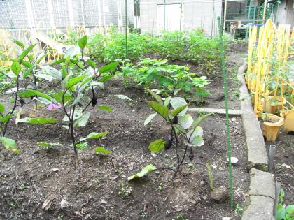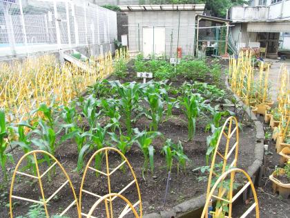 5月22日にお知らせしたときの中庭の野菜が、こんなに元気に成長しています。ナスは実がなっています。他もぐんぐん背が伸びています。みんながお世話したお蔭です。
