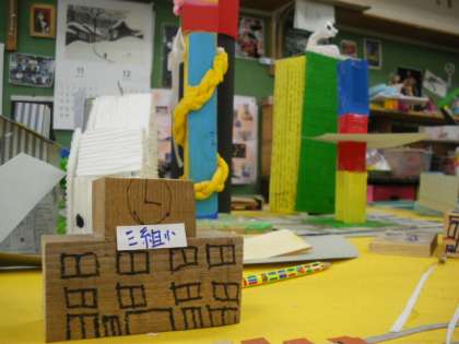 子どもたちがそれぞれ考えた家や店など、個性あふれるにぎやかな町になっていました。
