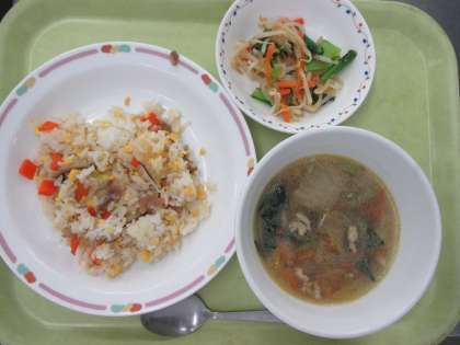 チャーハン 牛乳 ナムル 白菜と春雨のスープ