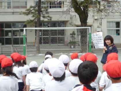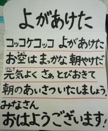 2の1の中村るい先生の教室の黒板に、写真のような歌詞が貼られてありました。楽しそうな歌に思えたので、校庭で大きな声で歌ってもらいました。みんな今日習ったばかりの歌でしたが、とても大きな声を出して歌ってくれました。明日からの朝の会が楽しみです。校長室にも聞こえるくらい大きな声で歌ってください。