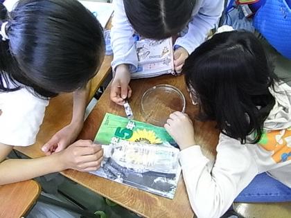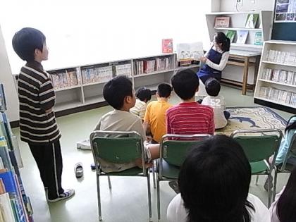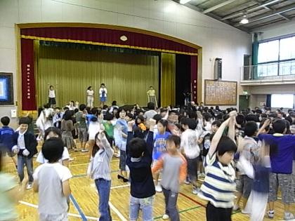 児童集会(学校クイズ)、5年生「メダカの観察」の様子。中休みのお話バスケットの様子。