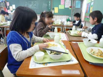 今日から待ちに待った小学校1年生の給食が始まりました。今日のメニューは、ちらしずしで、1年生の給食スタートをお祝いしました。子どもたちは、準備段階から興奮気味で、「嫌いなものも全部食べるんだ!」「残さず食べるんだ!」「私も!」とわいわい。給食当番も白衣に着替えて、みんなに一生懸命配っていました。今日からの1週間は、各クラス2,3名のフレンドシップのお母さん方が給食のお手伝いをしてくれることになっています。ありがたいことです。自分の机の上に給食が並ぶと、じっとちらしずしを眺めたり、カルピスゼリーを指で触ったり、うれしそうでした。日直さんが「いただきます」というと一斉に食べ始めました。