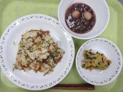 豚肉とごぼうのごはん 牛乳 きのこ入り煮浸し 白玉しるこ