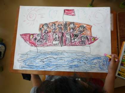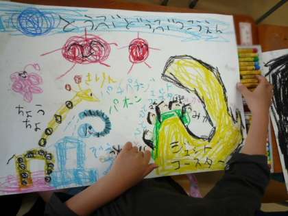 1年3組をのぞいてみると、ゴールデンウィークで楽しかったことを子どもたちが一生懸命クレヨンを使って描いていました。「船に乗ったの?どこに行ったのかな?」「どこだかわかんない」の答えが返ってきました。でも、それぞれが楽しい休日を過ごしてきたことが絵から伝わってきました。