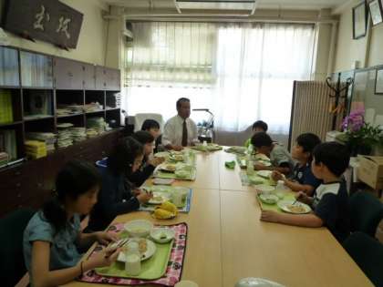 恒例になりました、5年生との校長室での会食が始まりました。9月の川場移動教室の前までに子どもたちと仲よくなろうと思って計画しています。今日は、5年1組の8人の子どもたちと楽しく食事をしました。とても上手に自己紹介ができて、子どもたちの顔と名前を覚えることができました。最後に、お茶をごちそうしました。子どもたちは最後まで飲みほして、後片づけをしっかりして校長室を出ていきました。