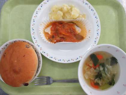 ぶどうパン 牛乳 魚のピザ風 粉ふきいも 野菜スープ
