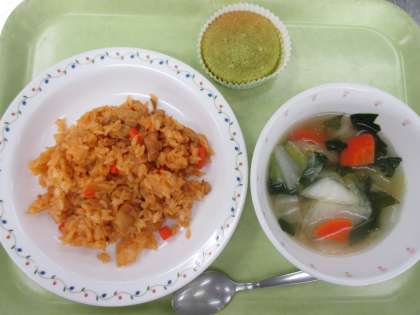 チキンライス 牛乳 白菜のスープ ほうれん草のケーキ