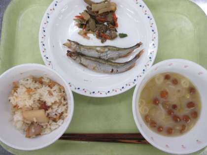里芋ごはん 牛乳 焼きシシャモ 茎わかめのきんぴら なめこの味噌汁