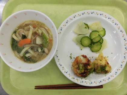 けんちんうどん 牛乳 たこ揚げ きゅうりと大根のごま風味