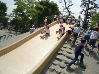 中休みの子どもたちの遊んでいる様子です。気温が久しぶりに上がった今日、中休み、力山が子どもたちの人気です。滑り台を何回も滑り下りする子、トンネルで休憩する子、それぞれに楽しんでいました。