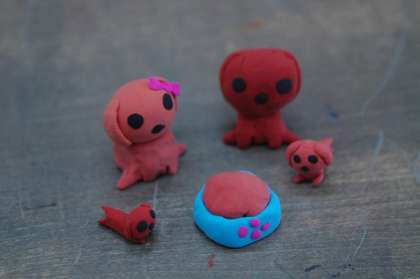 今、5年生は「おどる人形」を制作しています。木材、アルミ針金、軽量粘土などを組み合わせて、絵具で色を塗ったり、表情をペンで描いたり・・・。最後はつくった人形で、デジタルカメラを使ったコマ撮りアニメーションに挑戦する予定です。残った材料でかわいい動物をつくったりする子もいます。