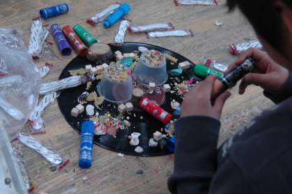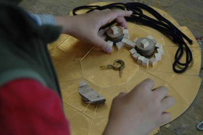 4年生の活動です。図工室の道具や材料などをならべて、つくえの上に顔をつくります。「できた!」と思ったら、デジカメでパチリ、また改造してパチリ・・・。つくりながら考え、工夫する力を培います。