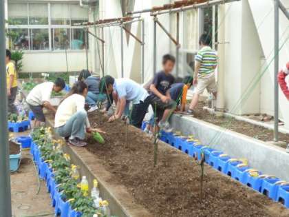 去年の4年生が植えた中庭の苗床を、今年の4年生が一生懸命雑草抜きをしたり、耕したりして、苗植えの準備をしていました。去年以上のへちまを収穫するためには、「連作障害にならないようにするんだ。」という専門的な知識を披露する子どももいて、にぎやかに作業をしていました。