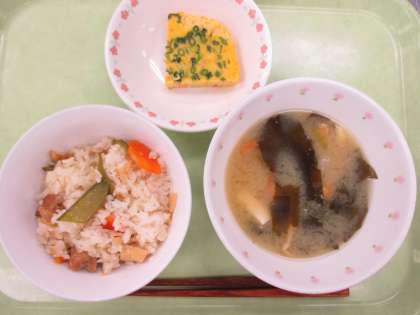 たけのこごはん 牛乳 卵焼き 味噌汁