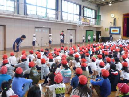 あいにくの雨模様のため、全校が体育館に集まって、運動会のためのラジオ体操の練習をしました。運動委員会のみんなが前に出て、お手本を示しました。1年生たちは真剣に見ていました。場所が場所だけに体を思いっきり伸ばすことはできませんでした。あと1週間、お家でも練習してほしいですね。