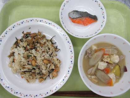 豆入りひじきごはん 牛乳 鮭の塩焼き さつま汁