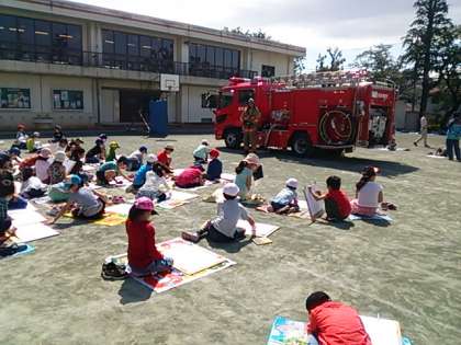 玉川消防署と玉川消防団8分団のご協力で、2年生が消防写生会をしています。