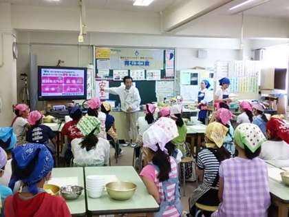 5年生は、昨日に引き続き出前授業でカラフル野菜のスープ作りを体験しています。