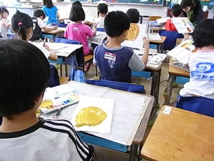 1年4組では、絵の具を使って初めての作品作りに取り組んでいました。この茶色の丸は何を描いているのかな?あとで教えてください。