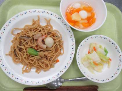 五目焼きそば 牛乳 辣白菜 フルーツ白玉