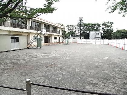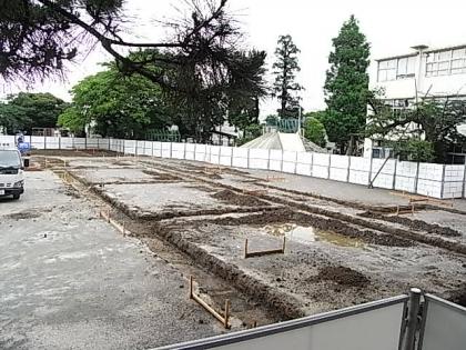 今、耐震補強工事は、校庭に仮設校舎を建てるための準備に大わらわです。校庭がこんなに削られて痛々しいです。狭くなった校庭には、校庭体育で使用する用具をしまうための架設の体育倉庫も建ちました。
