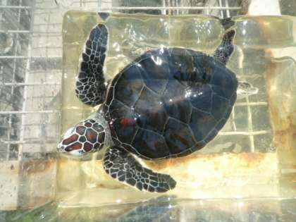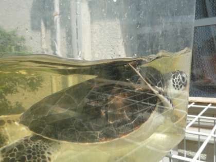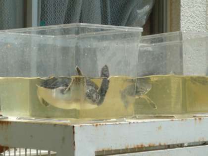 みらいとそらが久しぶりにお日さまに甲羅を当てて、いい気持ちになっていました。主事の中山さんと鈴木さんが水槽の掃除をしてくださっている時に、甲羅の生長を促進させるために甲羅干しをしていました。そらの胸板(?)の大きさにびっくりしました。