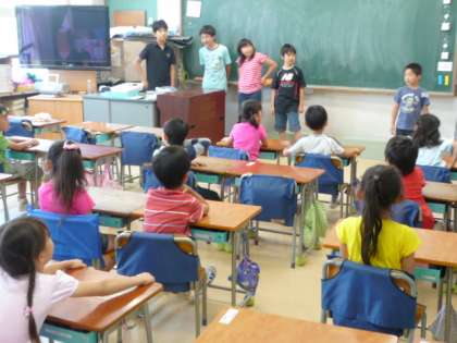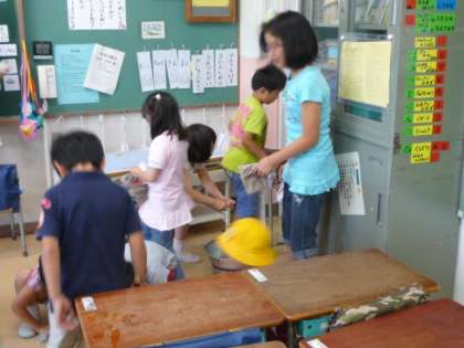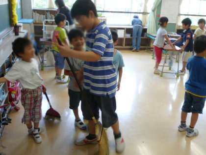 6年生が1年生にぞうきんがけの仕方やほうきのはき方を教えてくれているのを知っていますか?1年1組では、今週1週間の出来栄えを今日はチェックする日で、掃除が終わった後、1週間の反省として、6年生が1年生のぞうきんがけの様子とほうきのはき方のチェックをしていました。「両方とも上手にできました。」と6年生から褒められて、1年生は大喜びしていました。こんな交流場面から、6年生のリーダー意識が育っていくのです。1年生は、6年生をあこがれの対象にするんです。6年生ご苦労様でした。