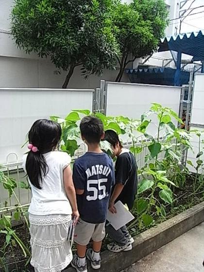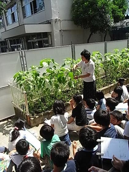 3年生が植えて育てているひまわりが、こんなに大きくなりました。子どもたちの背の高さを越えるものもあります。「1m11cmもあったよ。」「葉っぱがいい香りがしました。」「この前と比べてずいぶん伸びたから、今度は私より大きいかも」いろいろなことを気づいたり、考えたりしていました。