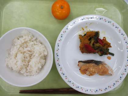 麦ごはん 牛乳 魚のピリ辛ソースかけ 夏野菜の南蛮かけ 冷凍みかん