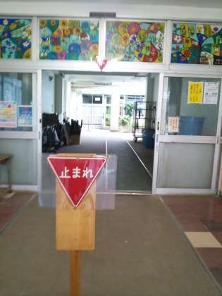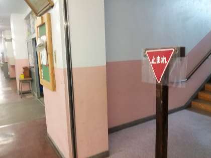 今週月曜日の朝会で、校長から一時停止の標識を用いて安全にむけて話をしました。その上で、校内の交差点(?)や曲がり角に標識を付けました。
