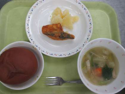 ココアパン 牛乳 魚のカレー揚げ 粉ふき芋 ベーコンと野菜スープ