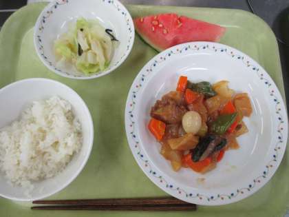 ごはん 牛乳 酢豚 きゃべつの塩昆布かけ 小玉すいか