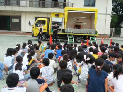 全校の避難訓練が終わった後、4年生が恒例の起震車体験を行いました。震度7までの地震の揺れを体験できるこの装置は、子どもたちにとっても激震をイメージできるとてもいい体験学習となることでしょう。