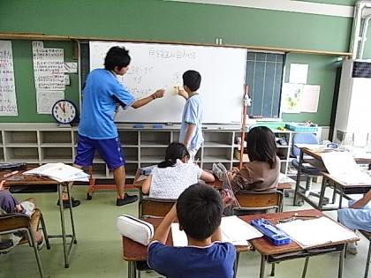 柴田先生による4年生の算数少人数指導場面です。ちょうど角度の勉強をしているところでした。三角定規の角度を分度器で測りとったり、三角定規をいろいろ重ねてできる角度を考えたりする楽しい授業でした。「あっ!180度から引けばいいんだ。」「60度と45度をたせばいいんだ!」という新しい発見をした喜びの声や目の輝きがすてきでした。子どもたちのやわらかい発想が光った時間でした。