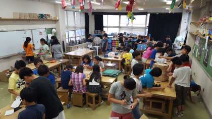 9月23日(金)、エコ玉小祭を開催する予定です。各学年、それぞれアイディアを出して準備をしています。6年生は体育館を使って、みんなが楽しめる活動を考えています。写真は必要な道具を作っている様子です。