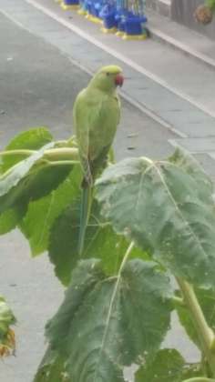 3年生の育てたひまわりの種を目当てに、大きなインコが 飛んできました。どこかで飼われていたインコが繁殖したとのことですが、朝早く登校した子供はちょっとびっくり、インコも人の気配に驚いて飛んでいきました。