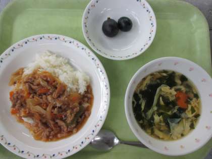 プルコギ丼 牛乳 かきたま汁 果物(巨峰)