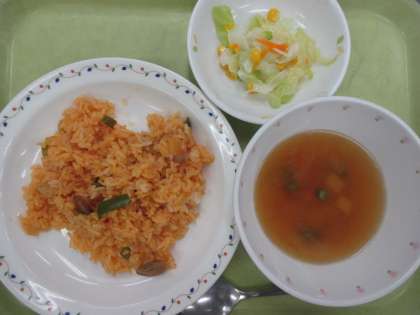 チキンライス 牛乳 コーンサラダ 白インゲン豆のスープ