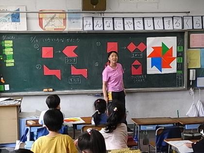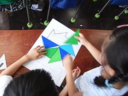 2年3組の阿河先生の算数の授業を見ました。「いろいろな形」の勉強でした。三角形の色板4枚を使って、「うつす」「ずらす」「まわす」「裏がえす」の基本動作を使っていろいろな形に変化させる学習でした。子どもたちが、色板を頭の中で動かしたり、実際に手で動かしたりしながら、図形を作っていく様子がパズルのようで楽しそうに学習していました。いろいろな発想が出てくる面白い授業でした。